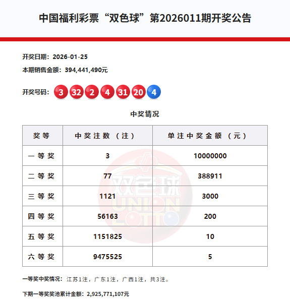 1月25日晚,中国福利彩票双色球游戏进行第2026011期开奖。本期双色球一等奖3注,单注奖金为1000万元。