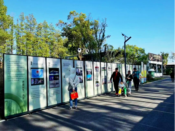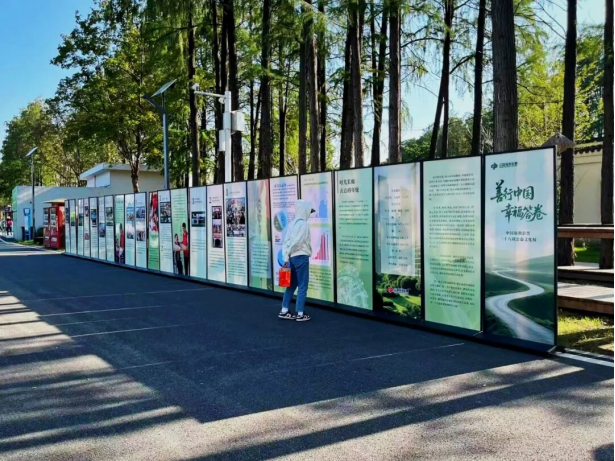 漫步在波光粼粼的湖畔,一边欣赏自然美景,一边在“爱心”板块前驻足。这里的展板设计充分考虑了自然环境特点,采用开放式布局,让公益故事与自然景观相映成趣。展板上那些记录福彩发行宗旨的图片,映衬着美丽的自然环境,更显生动感人。