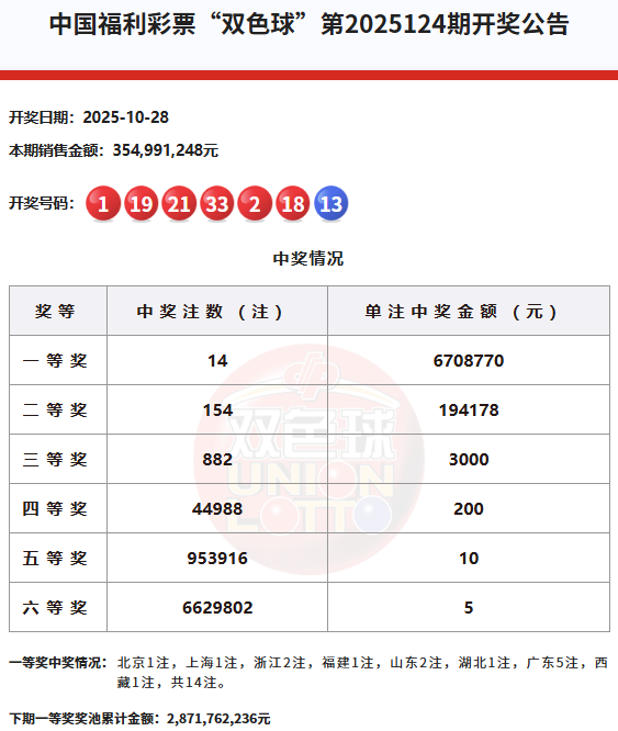 开奖丨双色球2025124期:北京中出一等奖1注、二等奖10注
