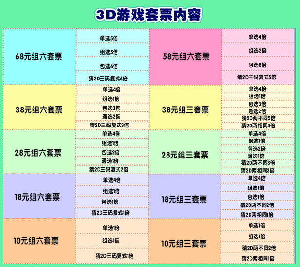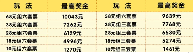 套票对应的奖金体系也很直观,组六套票,共分6档。购彩者投入68元,最高奖金超万元,可中10043元;投入10元,若中奖可以有1270元奖金。组三套票,共分4档,投入38元,最高奖金7768元;10元亦可有机会获得超千元奖金。