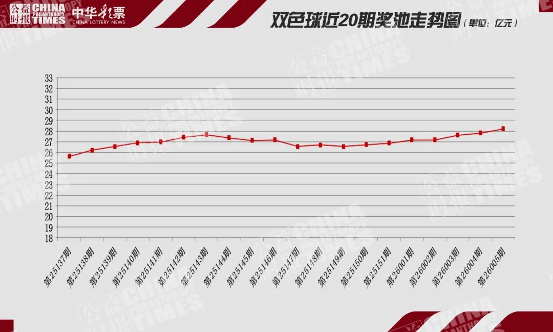该周的双色球第一期(2026003期)开奖中,一等奖共产生3注,奖池小幅增长,增至27.61亿多元;第二期(2026004期)一等奖中出4注,奖池持续蓄水,达27.82亿多元;该周第三期(2026005期)一等奖继续开出4注,双色球奖池继续蓄积,最终停留至28.21亿多元。