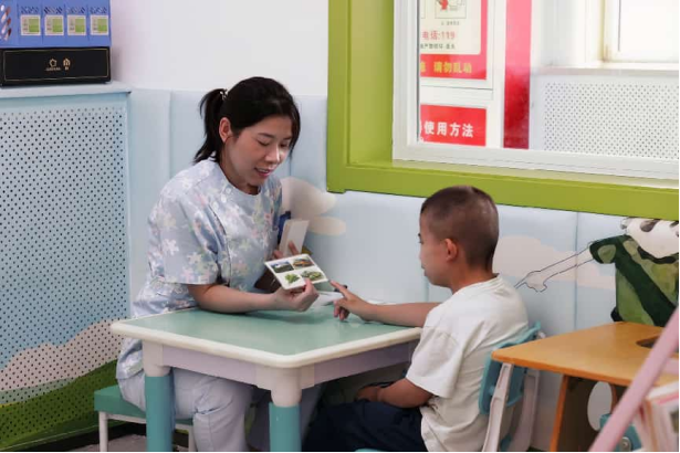 榆林市儿童福利院的特教老师正在教孩子认读。