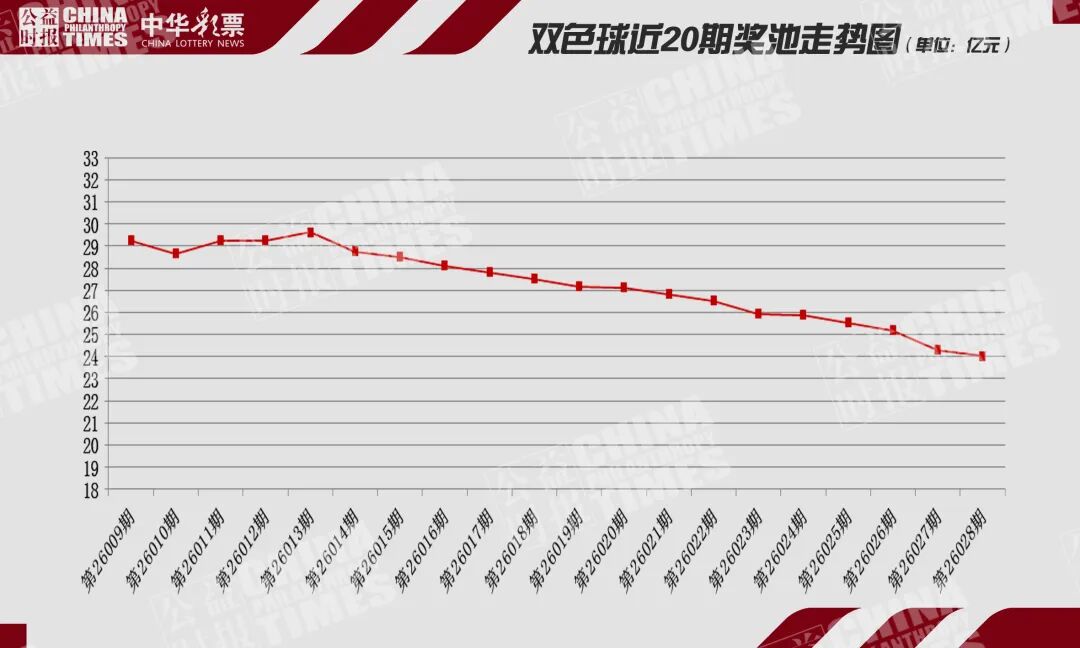 该周双色球第一期(第2026026期)开奖中,一等奖共中出7注,奖池回落至25.18亿多元;第二期(第2026027期)一等奖中出23注,奖池大幅下降至24.28亿多元;第三期(第2026028期)一等奖中出5注,奖池继续回落,最终停留至24.03亿多元。
