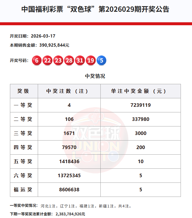 3月17日晚,中国福利彩票双色球游戏进行第2026029期开奖。本期双色球一等奖4注,单注奖金为723万元。